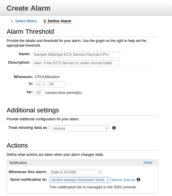 Next, we need to have an Alarm that also tells us that the ECS Service is operating within our normal performance measurements so that we know when our ECS Service is not under heavy loads. Let's set an Alarm for when the ECS Service 'sample-webapp-ecs-service' is running at or below 35% CPU Utilization for over 10 consecutive periods. In practice, I have found that it safer to have a longer period of inactivity to scale down the cluster. This ensures I do not scale down, then scale up, and then scale down unnecessarily.