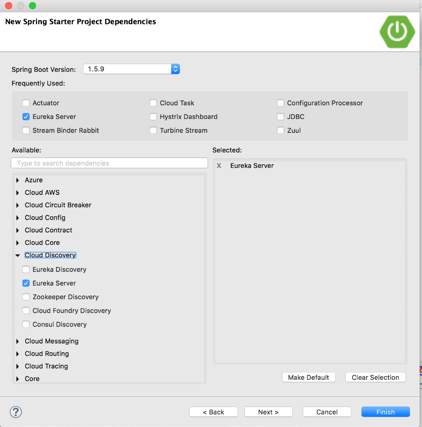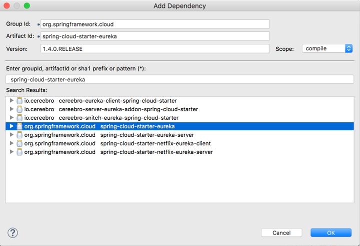 - Select "org.springframework.cloud spring-cloud-starter-eureka":