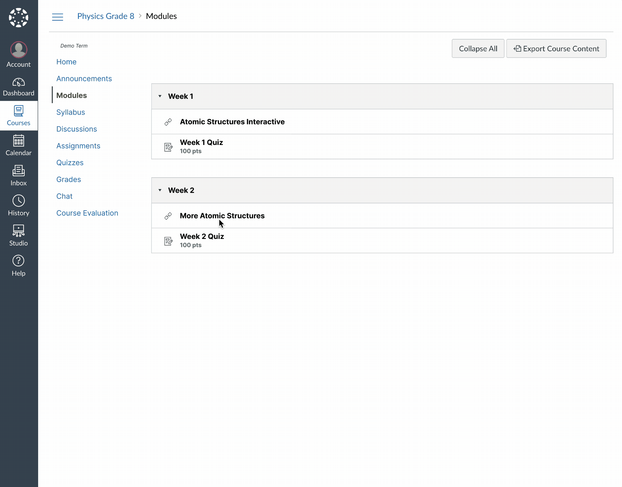 As shown below, to the end user this is just like clicking on any other link in the LMS, but they’re immediately brought to the enriched content provided by the Biology Puzzle tool. In this example, the LTI tool is accessed from within a module in Canvas. However, there are many spots within each LMS where the LTI link can be placed, such as either of the left hand navigation bars that are shown below, among dozens of others.
