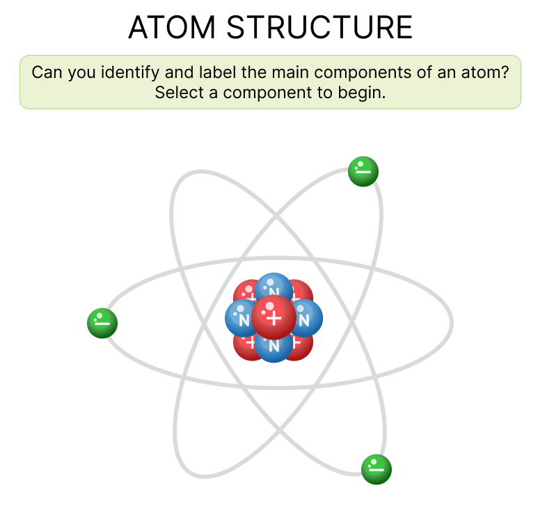 The learner is presented with an interactive diagram of an atom and is asked to label its main components: protons, neutrons, and electrons.